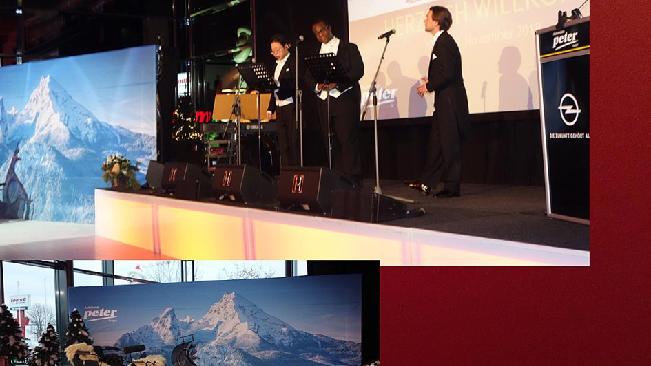 Die winterliche Berglandschafft mit Schneeschlitten macht deutlich, wie im Autohaus Peter zum Eröffnungsevent jedes Detail inszeniert wurde.
