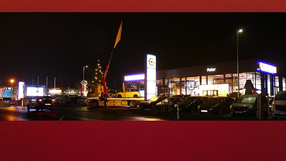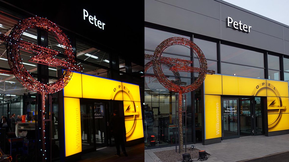 von 23: Die Opel-Porta-Peter, der Haupteingang zum "Neuen". Markant mit dem lebenden "Natur-Blitz" aus dem Hause Peter. Die Kontrastwirkung des Haupteingangs: Tag und Nacht!
