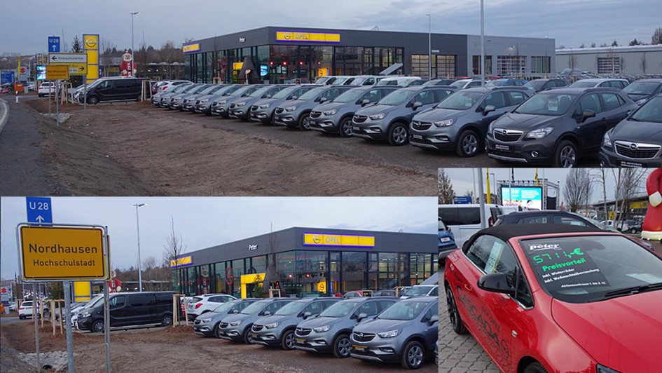von 23: Der neue Opel-Exklusiv-Betrieb der Peter Gruppe in Nordhausen. Eine langgezogene Glasfront, die im rechten Winkel, Fenster an Fenster Fortsetzung findet. Eine aufwändige Bauweise. Das neue Opel-Neuwagenverkaufsareal, 1.300 qm groß, einer "Car-Highlight-Fläche" und drei Verkäufer-Inseln. Achit Tölle, seit Jahren für den Opel-Standort Nordhausen in der Peter-Gruppe verantwortlich: "Wir haben für 2019 200 Neu- und 300 Gebrauchtwagen geplant."