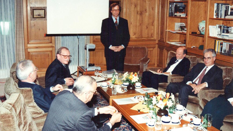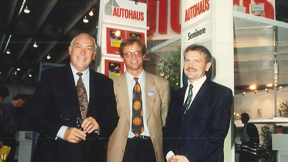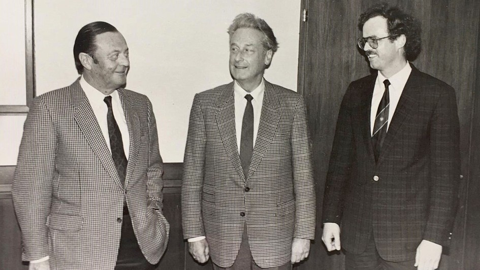 von 12: 1984 wurde die Idee zur ersten automobilen Stiftungsprofessur an einer deutschen Uni gelegt: Brachat (r.) suchte eine Hochschule, Prof. Dr. Günter Eidenmüller (l.), MB Scholz, baute als Senator der Uni Bamberg die Brücke zu Rektor Prof. Dr. Siegfried Oppolzer (M.).
