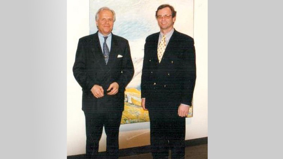 von 12: Im Jahr 1986 noch Schwarz auf Weiß: Prof. Hannes Brachat (l.) im Interview mit MAHAG-Chef und ZDK-Präsident Fritz Haberl. Diesen charakterisiert Brachat gerne als "Franz Josef Strauß des Kfz-Gewerbes".