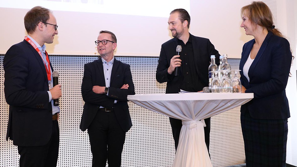 von 22: Nicolas Amman, Leiter Hahn Akademie, Prof. Dr. Stefan Reindl, Direktor IFA Institut, Patrick Neumann, stellv. Chefredakteur AUTOHAUS, und Sylvia Gerl, Geschäftsführerin BFC bei der Podiumsdiskussion