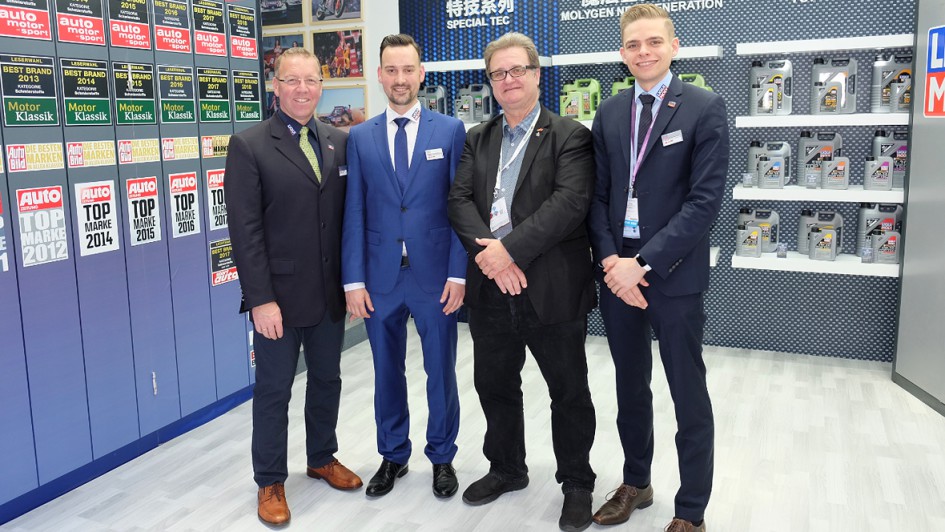 von 20: Von Anfang an in China: Liqui Moly wollen auch weiterhin in China mit "Made in Germany" wachsen und bieten auch Produkte für Hybrid-Fahrzeuge an. Adrian Stormer, Export Area Manager (2.v.l.), Willie Boehler (AUTOHAUS), Fabian Wedekind, Project Development Manager (1.v.r.)