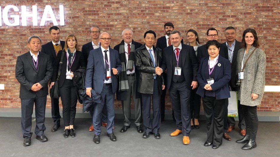von 20: Vize-Präsident Christian Heep (6.v.r.) von der German Federal Association for eMobility (BEM) mit seiner europäischen Wirtschaftsdelegation auf der Automechanika 2018 in Shanghai / Handshake mit CECC-Präsident Ning Wang (8.v.r)