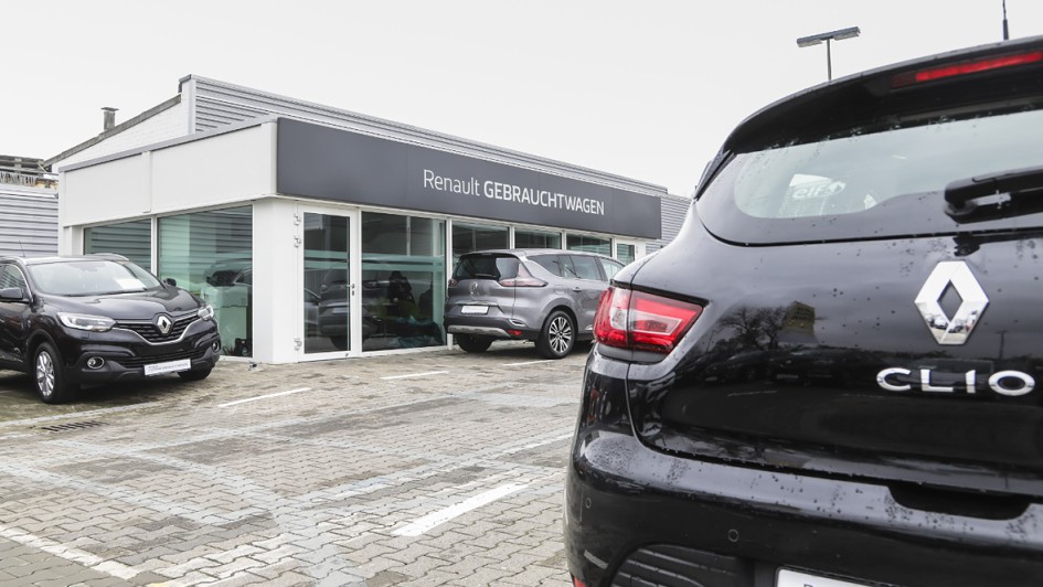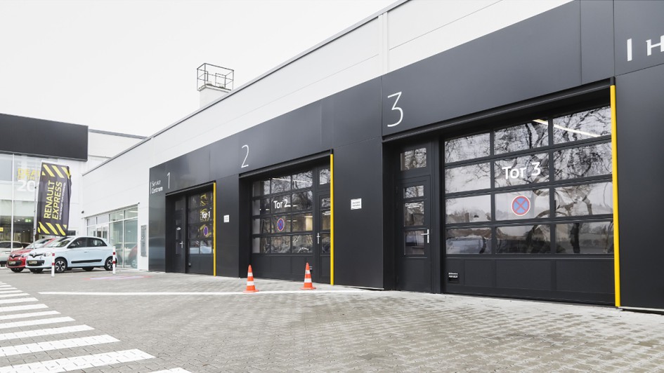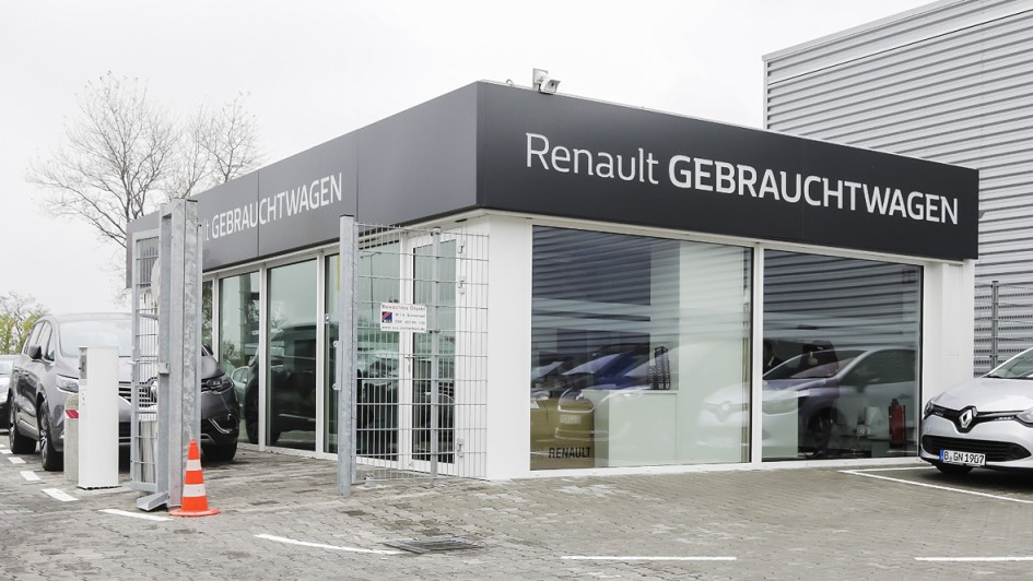 Entlang der gesamten Länge des Schaufensters gibt es eine Streckmetall-Attikaverkleidung in Dunkelgrau mit dem Renault Schriftzug sowie dem Schriftzug des Händlers.