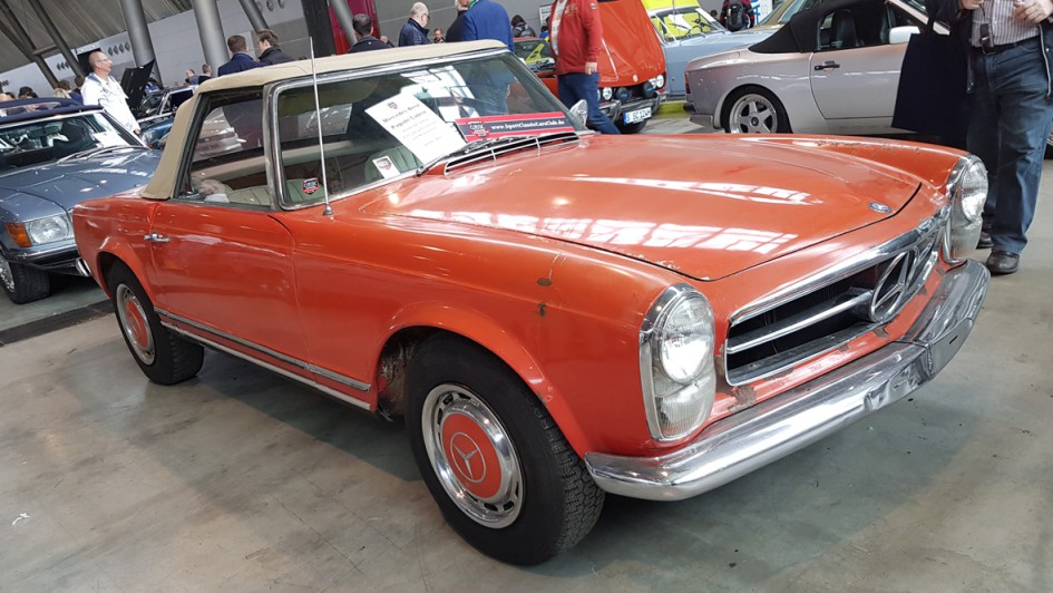 von 21: Pagoden waren auf der Retro Classics etliche zu sehen. Diese hier hatte eher Seltenheitswert. Entgegen den anderen auf Hochglanz polierten Exemplaren trug sie ihre ausgeprägte Patina stolz zur Schau. Genau das Richtige für jemanden, der nach einem Restaurationsobjekt suchte. Denn der Preis lag bei "nur" 29.950 Euro. Das Gros der begehrten W 113-Reihe von Mercedes-Benz bewegt sich eher zwischen 80.000 und 120.000 Euro.