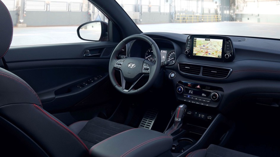 von 10: Am auffälligsten sind aber die roten Ziernähte an den schwarzen Leder-Stoff-Sitzen. Letztere sind allerdings genauso weich gepolstert wie das Standard-Gestühl. Das N-Line-Modell fährt serienmäßig mit Edelstahl-Pedalerie vor, ansonsten aber bleibt es bei der übersichtlichen, unaufgeregten Inneneinrichtung des Standard-Tucsons.