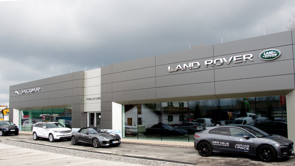 von 3: Freuten sich über das neue Premium Cars Rosenheim Gebäude und den neuen Evoque, mit dessen Einführung das neue Autohaus der Auto Eder Gruppe an diesem Wochenende eröffnet wird (v.r.n.l.): Geschäftsführer Willi Bonke, Brian Fousse, Manager Business und Transformation bei Jaguar Land Rover Deutschland, und Premium Cars Rosenheim Verkaufsleiter Benjamin Haas.