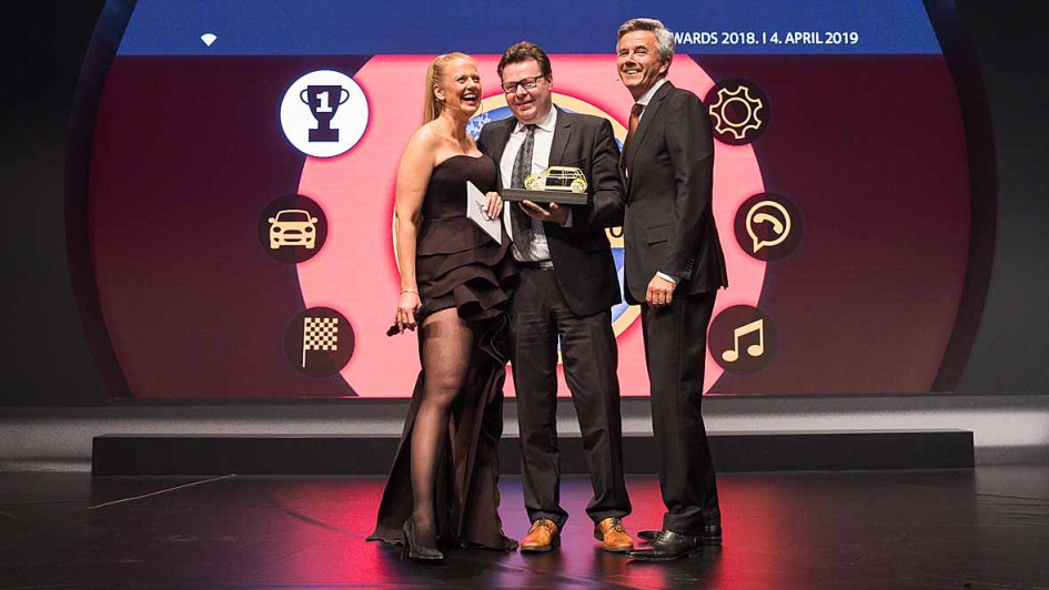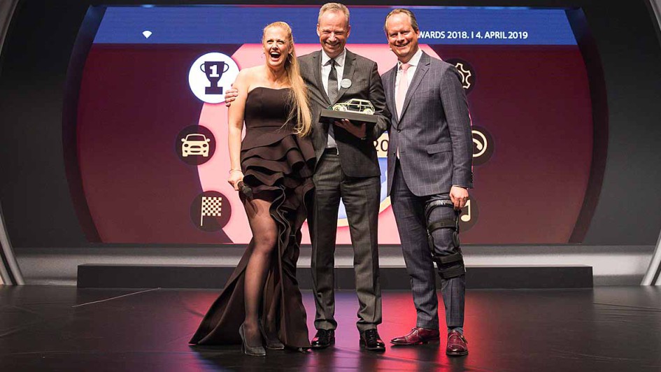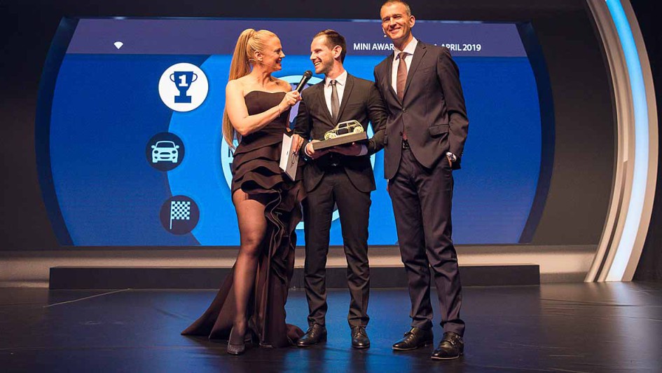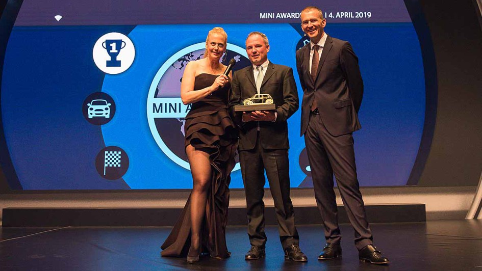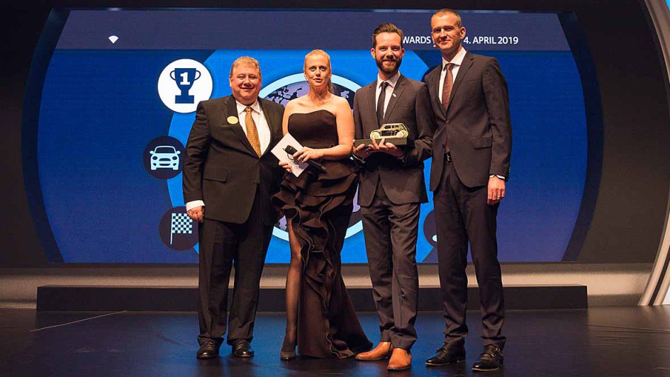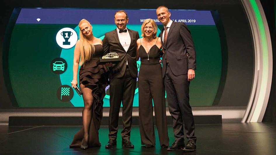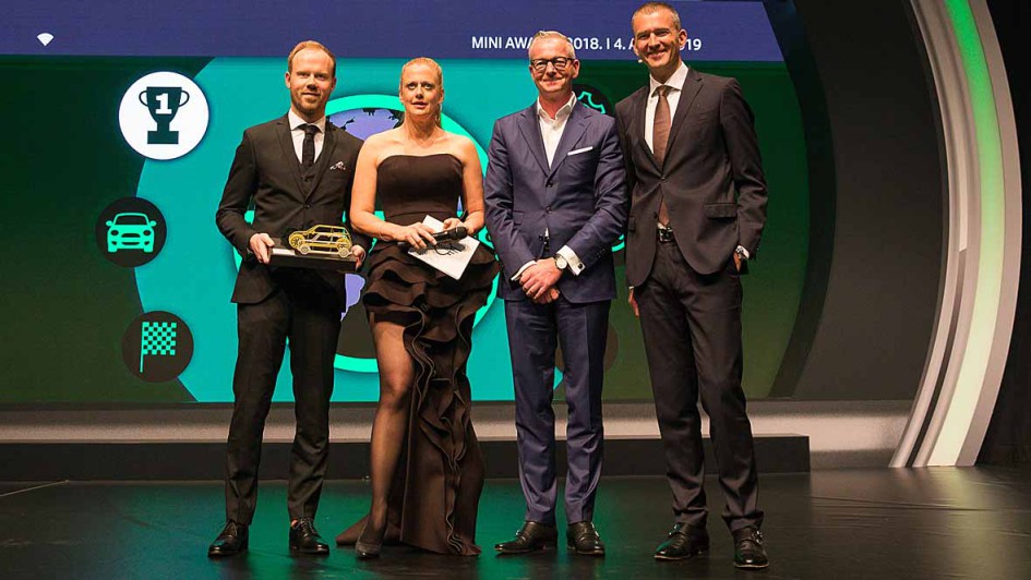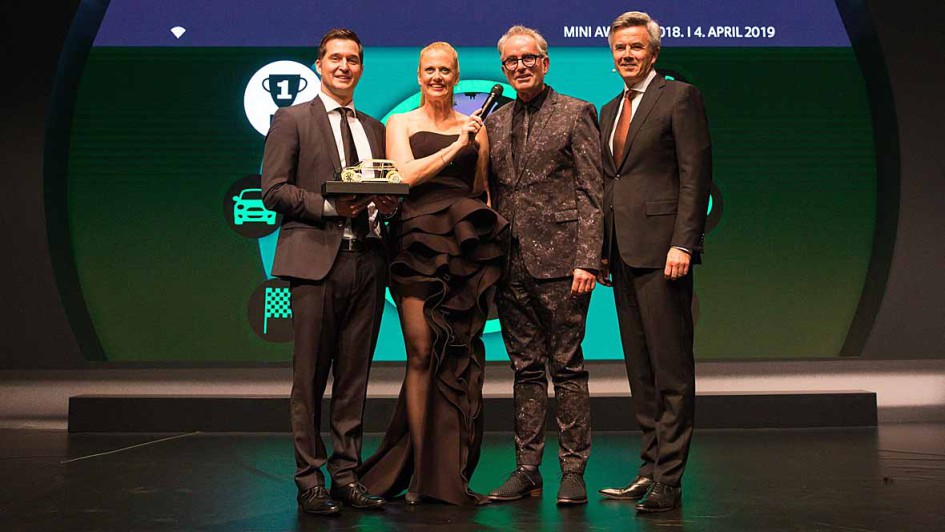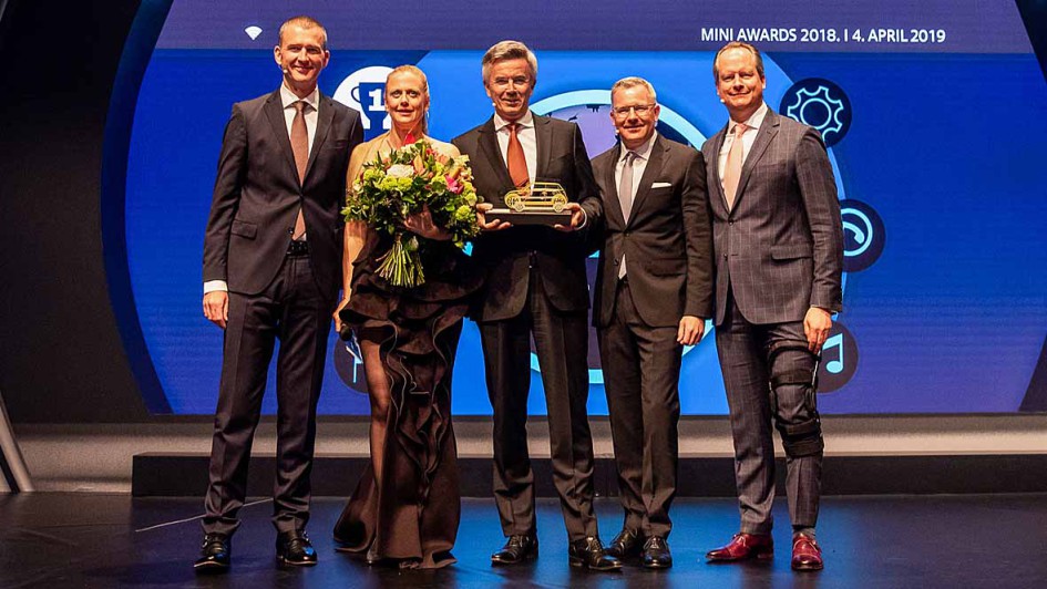 Gruppenbild der Laudatoren (v.l.n.r.): Christian Ach (Leiter Vertrieb und Direktgeschäft BMW Deutschland), Moderatorin Barbara Schöenberger, BMW-Vorstandsmitglied Peter Schwarzenbauer, Wolfgang Büchel (Leiter Mini Deutschland) und Sebastian Mackensen (Leiter BMW Deutschland)
