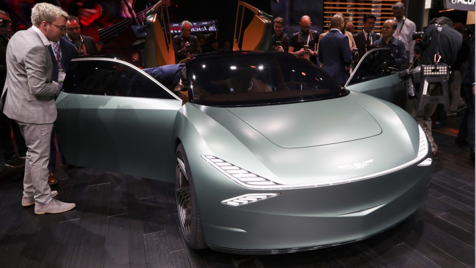 von 10: Elektrisch fährt das knackige Coupé Mint, das die feine Hyundai-Tochter Genesis auf die Bühne geschoben hat. Der flache Flitzer mit extrem tiefer Front ist für die Großstadt gedacht, fährt aber nicht als unförmiger Personentransporter vor, sondern spielt mit Nissan-370-Z-Optik ganz klar die Emotionen-Karte aus.