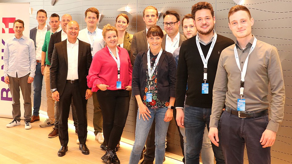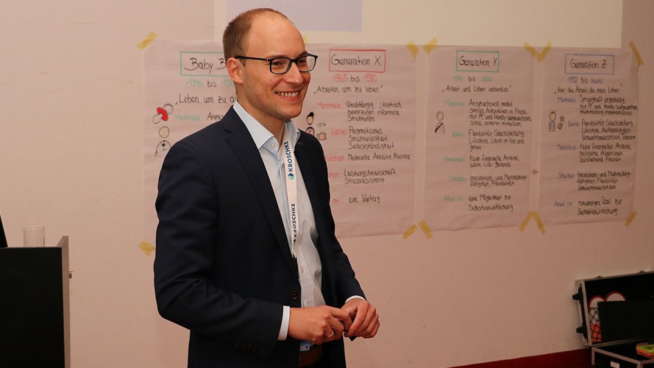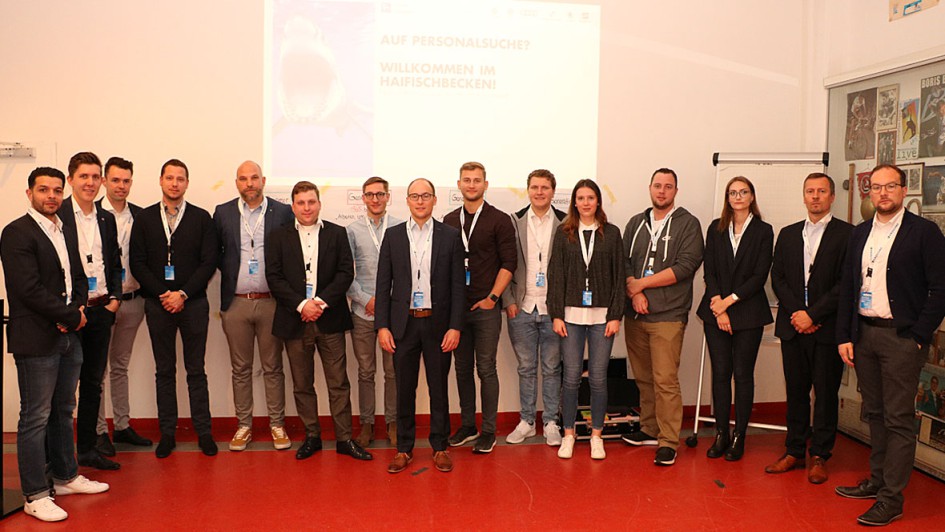 von 29: Gruppe A vor dem Start ihres ersten Workshops. An der Wand des Seminarraums hingegen Boxhandschuhe, Plakate und Fußball-Wimpel - ein historisches Ambiente für das Zukunftsthema Recruiting.