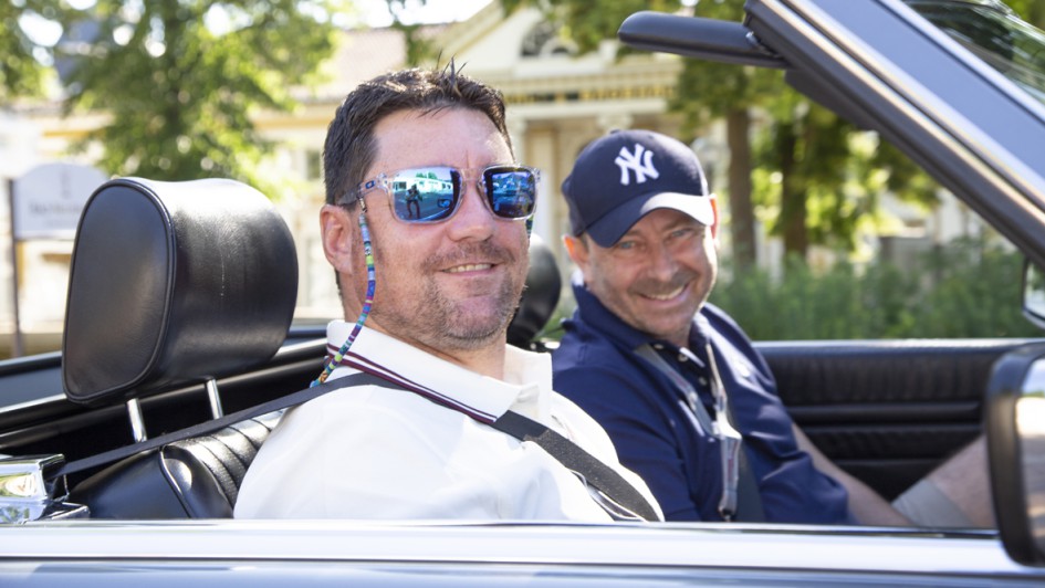 von 17: Bestes Sonnenbrillenwetter: Björn Leonhardt (mit Hut) und Sven Schmidt, Autohaus Meklenborg. Ihr Auto, ein Mazda RX-5, gehörte zu den Exoten im Starterfeld.