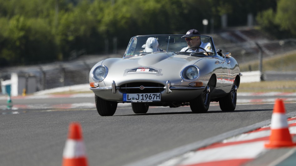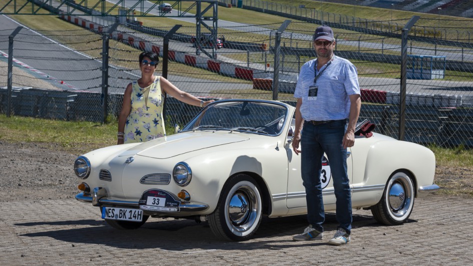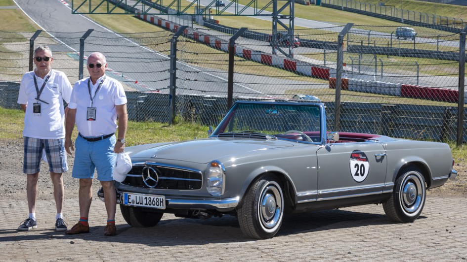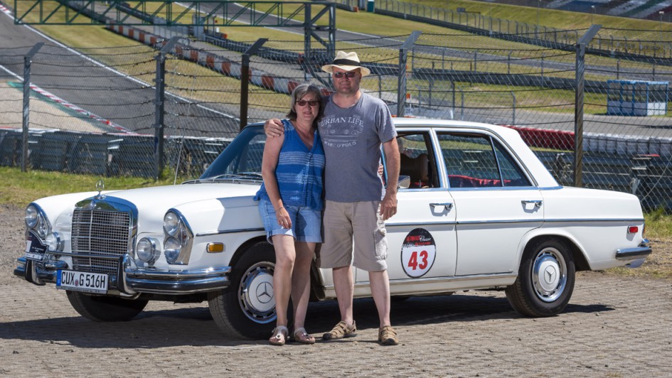 von 17: Mit einem weißen Mercedes-Benz 280 SE, dem Nachfolger der legendären Heckflosse, gingen Petra und Guido Küver, Autohaus Küver, an den Start.