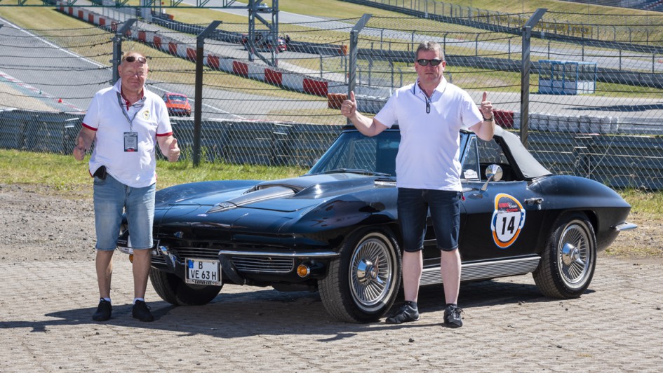 von 17: Wolfgang Matner (l.), Caravan Center Matner, und Bernd Wulbusch, Autodienst Hoppegarten, fuhren in einer Corvette C2 vor. Gemessen an den Pferdestärken gehörte ihr Cabrio mit 350 PS zu den stärksten Fahrzeugen im Teilnehmerfeld.