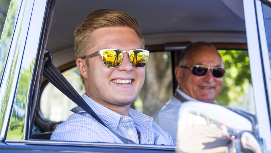 von 17: Sebastian Leven (vorne), Autohaus Leven, und Fabian Schultz, Autohaus Saparautzki, fuhren einen Mercedes 280 SE Coupé von 1970. Die 107er-Baureihe mit dem Stern war eines der am häufigsten vertretenen Modelle der Rallye.