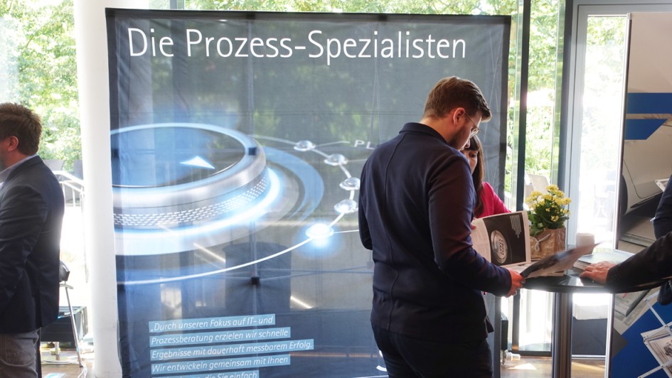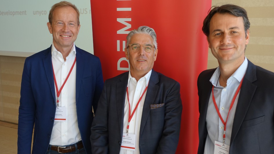 von 14: André Garrels (l.) von der Berolina-Gruppe erläuterte, wie man es mit innovativem operativem Prozess-Coaching in die Service-Champions League schafft. Weitere Referenten waren unter anderem Jürgen Konzorr (M.), Elite Consulting Network Group, und Jonas Wagner, Berylls Strategy Advisors.