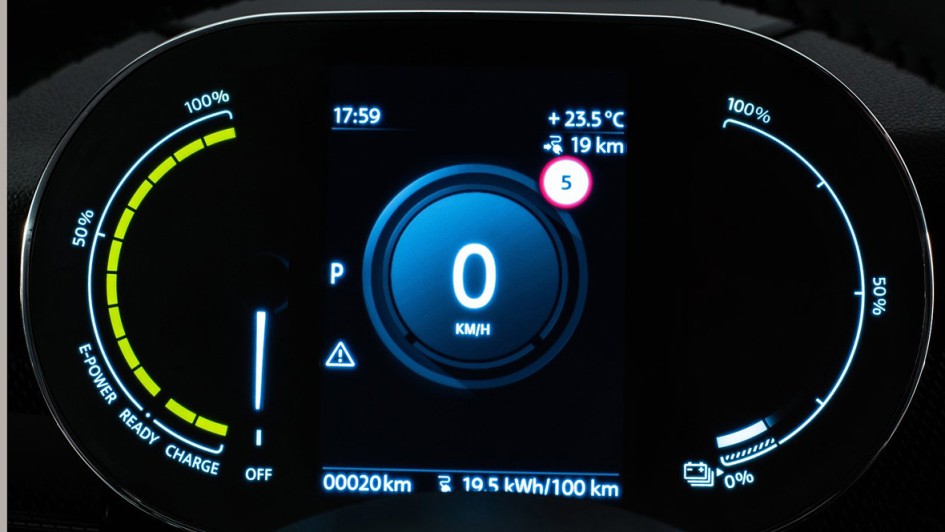 von 16: Neu im Elektro-Debütant: Direkt hinter dem Lenkradkranz ist ein 5,5-Inch-Display, auf dem Geschwindigkeit und Ladezustand ins Blickfeld gerückt werden. Es kann zudem individuell mit weiteren Infos bestückt werden.