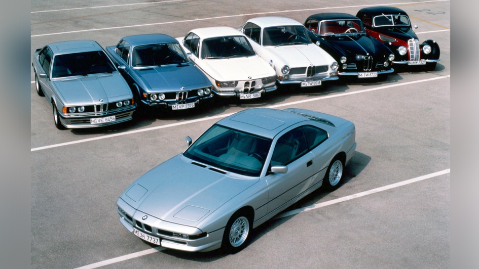 von 11: Der 8er und seine Vorfahren. Mit vor 30 Jahren einzigartigen technischen Meilensteinen sollte der 850i alle vorausgegangen blauweißen Coupés überstrahlen, darunter so unterschiedliche Typen wie das ultrateure V8-Coupé BMW 503 (2. v. r./ab 1955) und das Vierzylinder-Hardtop 2000 CS von 1965 (3. v. l.).
