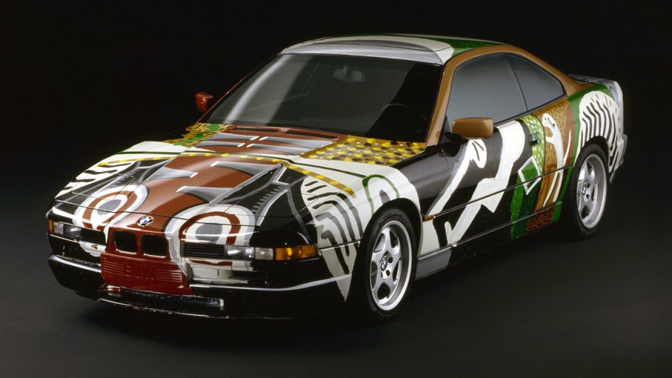 von 11: Den 8er gab es auch als Art Car. 1995 nahm sich David Hockney einen 850CSi vor. Der Künstler kehrte konsequent das Innere nach außen und machte es in ungewöhnlicher Wahrnehmung transparent: Auf der Motorhaube erscheinen stilisierte Ansaugstutzen des Motors, durch die Tür ist der Fahrer zu erkennen, auf dem Rücksitz ein Dackel.