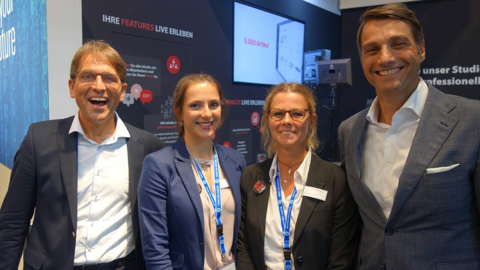 Am AUTOHAUS next-Stand: Patrick Fruth, CEO Division Mobility TÜV Süd (re), Alexandra Wutz und Nina Lipp vom AUTOHAUS next-Team sowie puls-Geschäftsführer Dr. Konrad Wessner.
