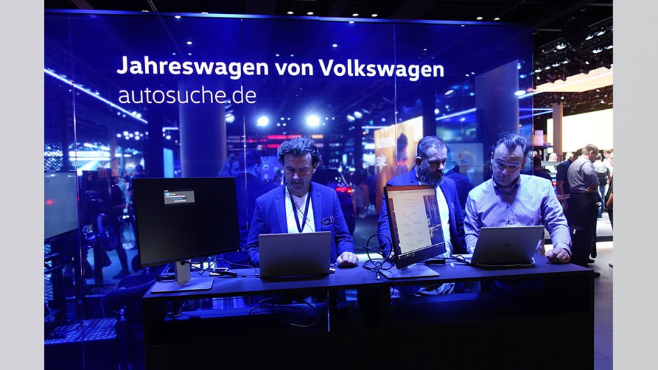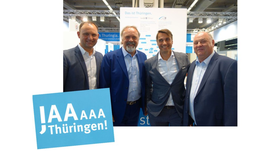 von 46: Das Land Thüringen war auf der IAA mit einem eigenen Stand vertreten. Das Schwabenland nicht! Helmut und Andreas Peter, die beiden "Außenflügel", Mercedes-Vertreter aus Nordhausen, begrüßten dort Patrick Fruth, CEO Division Mobility TÜV Süd und Erik Wakolbinger, Senior Vice President Dekra Group.