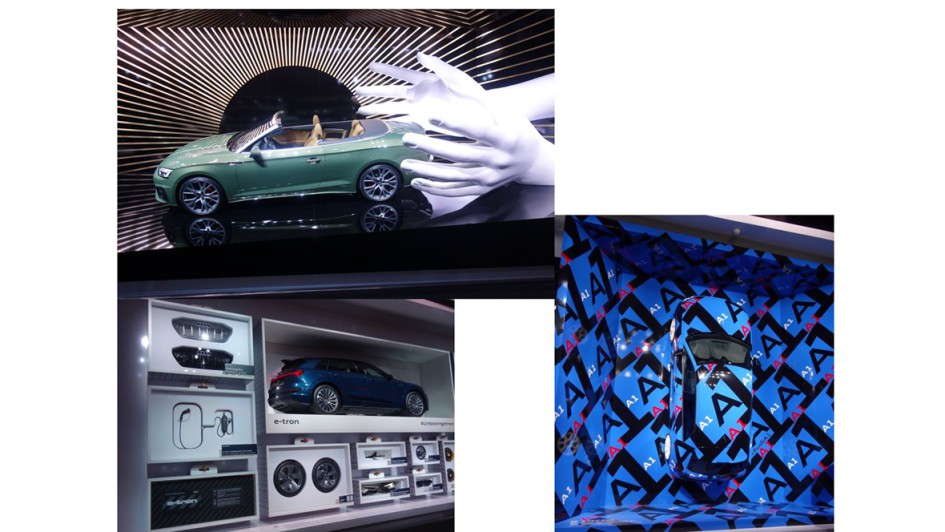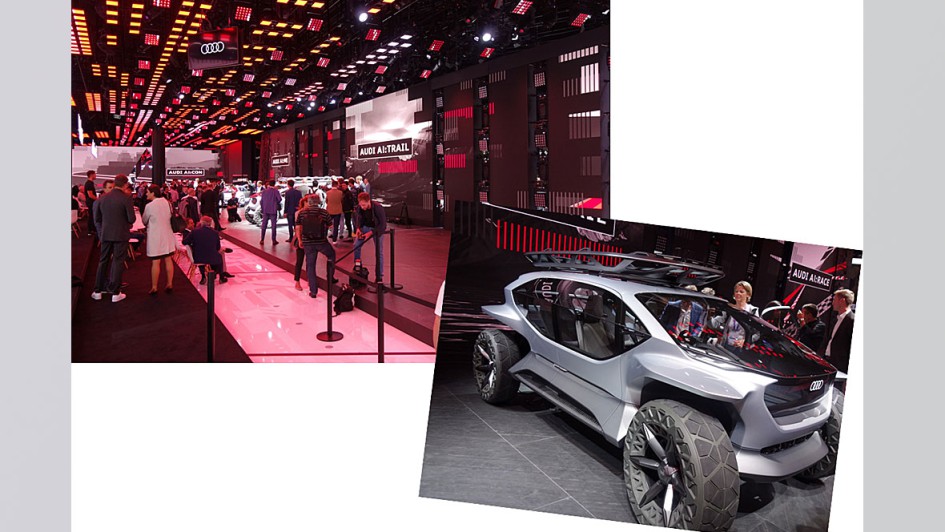 von 46: Wow! Was für ein Stand-Gestaltungswurf. Diese Vielfalt, die Lichteffekte, all die kreativen Motive, die Modell-Spezies: Mit dem AudiAI:Trail quattro wurde der elektrisch angetriebene Offroader präsentiert. Der Geländewagen der Zukunft. Fünf Drohnen mit integrierten Matrix-LED-Elementen sorgen für Fernsicht.