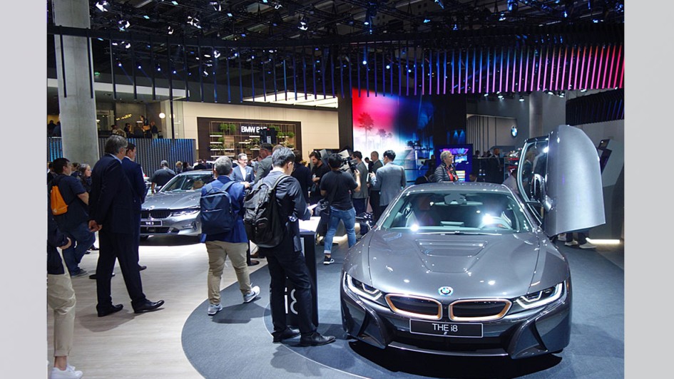 von 46: BMW hat seinen Messestand in der Fläche wie im Budget um zwei Drittel gekürzt. Von einst 11.000 Quadratmeter blieben 3.000 Quadratmeter übrig. Ganz hinten in der Halle 11. Da fehlte jegliche automobile Intention!