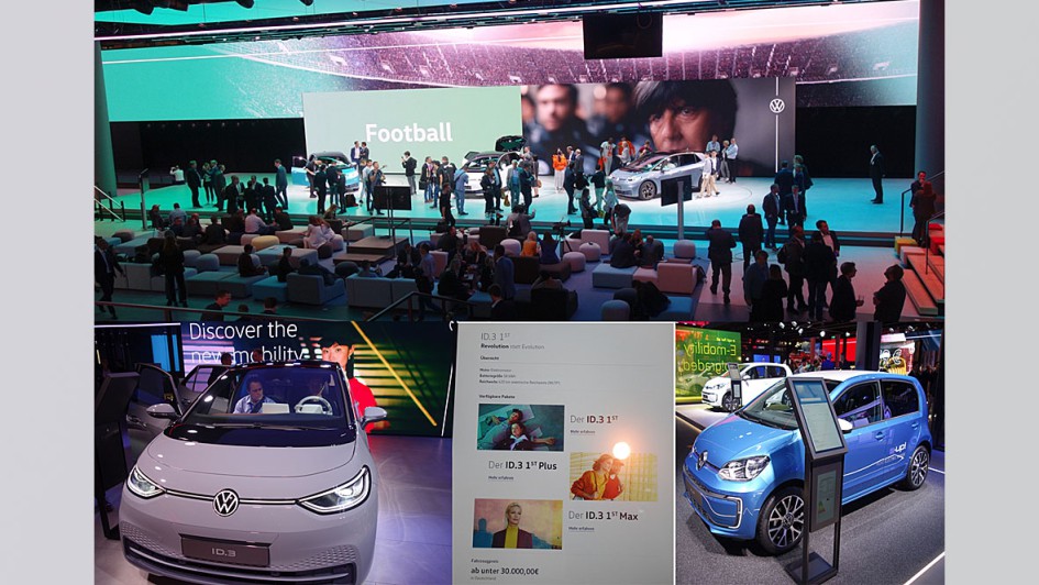 von 46: VW startete mit der IAA die neue E-Konzernausrichtung inklusive neuem Markenlogo. Die Weltpremiere des ID.3 ist angesagt. Er steht für Aufbruch und soll ein neues Zeitalter "einläuten". Der Einstiegspreis liegt – siehe Preisangabe – ab 30.000 Euro aufwärts. Davon gehen 4.000 Euro Umweltbonus ab. Reichweite bis zu 550 Kilometer. Der "Neue" basiert auf einem Modularen E-Antriebsbaukasten (MEB). Der e-Up in der zweiten Modellgeneration hat 260 Kilometer Reichweite und wird derzeit mit einer Leasingrate von monatlich 159 Euro offeriert. Der Stromer für die City steht! Kleinwagen fördern.
