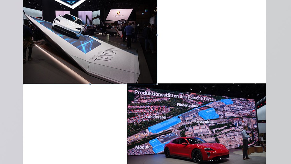 Auf einer gigantischen "Powerwall" (30 Quadratmeter) konnten sich die Standbesucher bei Porsche anschauen, wie in eineinhalb Jahren das neue CO2-freie Produktionswerk des Taycan in Zuffenhausen entstand. Es wurde offiziell am 8. September 2019 seiner Bestimmung übergeben. 1.500 neue Arbeitsplätze sind entstanden. Es liegen bereits 30.000 Vorbestellungen bereit. Der grüne Ministerpräsident von Baden-Württemberg, Winfried Kretschmann, der diese Woche auch seine erneute Kandidatur als Ministerpräsident bekannt gab, meinte in Anspielung auf Tesla: "Hier ist ein grünes Wunder entstanden. Und das mit schwarzen Zahlen."