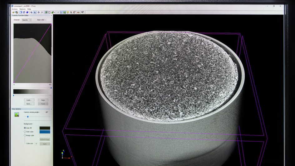von 6: Der Schnee wird mittels Micro-Computertomografie analysiert und in 3D-Modelle umgewandelt und mithilfe von Computersimulationen für die Berechnung von Winterreifenprofilen genutzt.