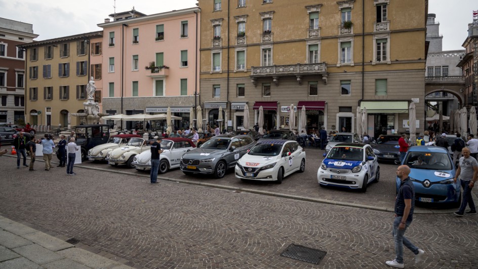 von 4: Der Oldtimer-Rallye Mille Miglia hat einen Ableger bekommen. So fand 2019 erstmals die "Mille Miglia Green" statt - ein Wettbewerb für Elektro- und Hybridautos.