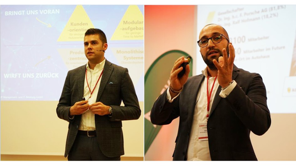 von 32: Aret Bedoyan und Marc Eschen von MHP, einem Porsche-Tochterunternehmen, zeigten auf, wie man eine begeisternde Customer Experience für die eigenen Kunden schafft. Inhaltlich reichte die Darstellung von der Generation Greta bis zur Invasion von Touchpoints. 95 Prozent der Leads kommen digital. Sie zeigten als Synthese die "Integrierte Datenbank" auf.