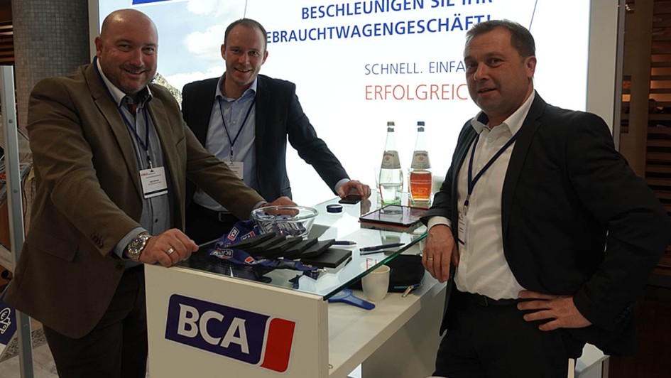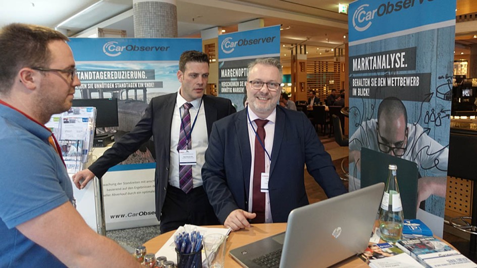 von 32: Marc Gounaris, Marketing-Zielgruppenmanager Kfz-Gewerbe (re), und Marco Löding, Fachgebietsverantwortlicher GW-Management. Im Bild Michael Tziatzios, Leiter GW-Management Dekra. Auf dem Stand trafen wir das Handelsgenie Mike Siebrecht (re), Opel-Phänomen aus Uslar, sowie seinen Verkaufsleiter Mohamed El Zahran (27)! Im Hintergrund wirkt abermals Bibi Steinhaus.