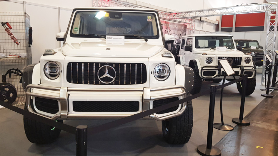 von 12: "Liebling, ich habe die G-Klasse geschrumpft" - unter diesem Motto könnte der Messeauftritt von Tibus gestanden haben. Die Offroad-Spezialisten zeigten eine höhergelegte G-Klasse (vorne) und gleich daneben den kleineren Bruder, einen Suzuki Jimny. Angesichts der gleichen Farbe, der Portalachsen und der Verbreiterungen waren sich die beiden Offroader zum Verwechseln ähnlich. Nur die Größe machte den Unterschied.