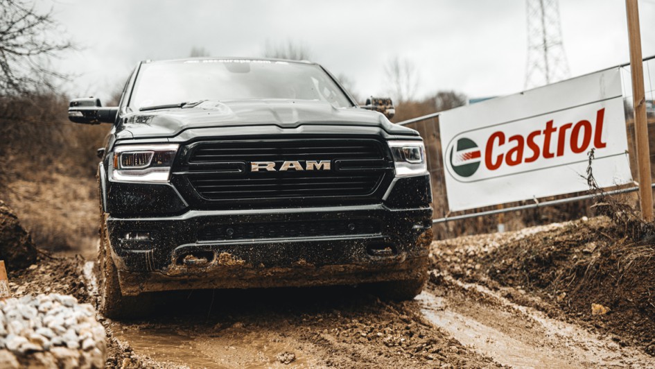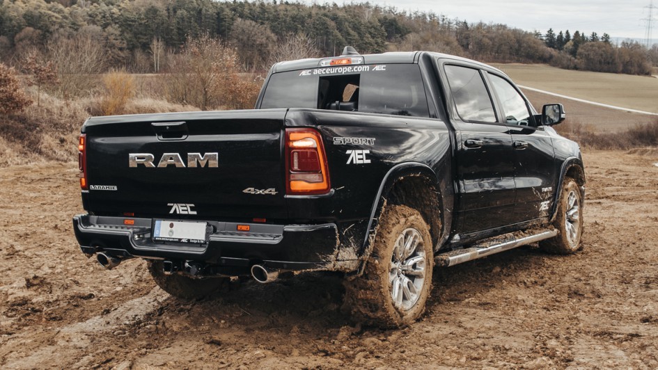 von 6: Seine Offroad-Qualitäten konnte der RAM Laramie 1500 Sport bei einem Ausflug in matschiges Gelände unter Beweis stellen. Während manche weichgespülte SUVs mittlerweile nur noch frontgetrieben erhältlich sind, verfügt der Pick-up serienmäßig über Allrad. Bei Bedarf kann der Fahrer auch auf Hinterradantrieb umstellen oder per Knopfdruck die Geländeuntersetzung aktivieren.