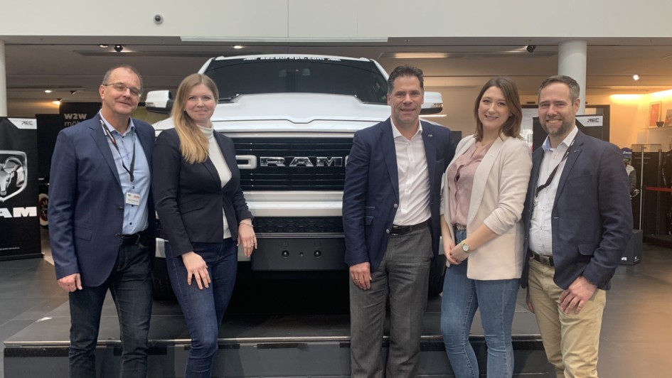 von 6: AUTOHAUS-Chefredakteur Ralph M. Meunzel (l.) war zu Gast beim Event "2020 RAM 1500 Laramie Sport Launch & Offroad Experience“ in Ingolstadt. Dort begrüßte ihn das Team von Auto Export Corporation (AEC): Natalie Gitter, Corporate Communications Director, Andreas Ossko, Head of Sales, Miriam Makrewitz, PR Manager, und Rene Möbius, Head of Sales.