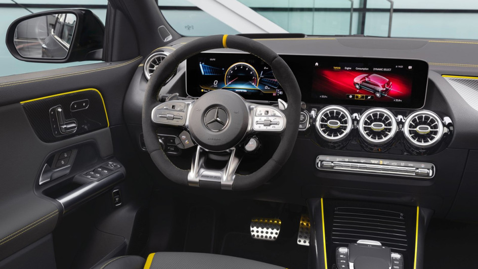 von 8: Innen gibt es unter anderem Sportlenkrad, rote oder gelbe Akzente auf Polster und Verkleidungen sowie das MBUX-Infotainmentsystem mit AMG-spezifischen Anzeigen.