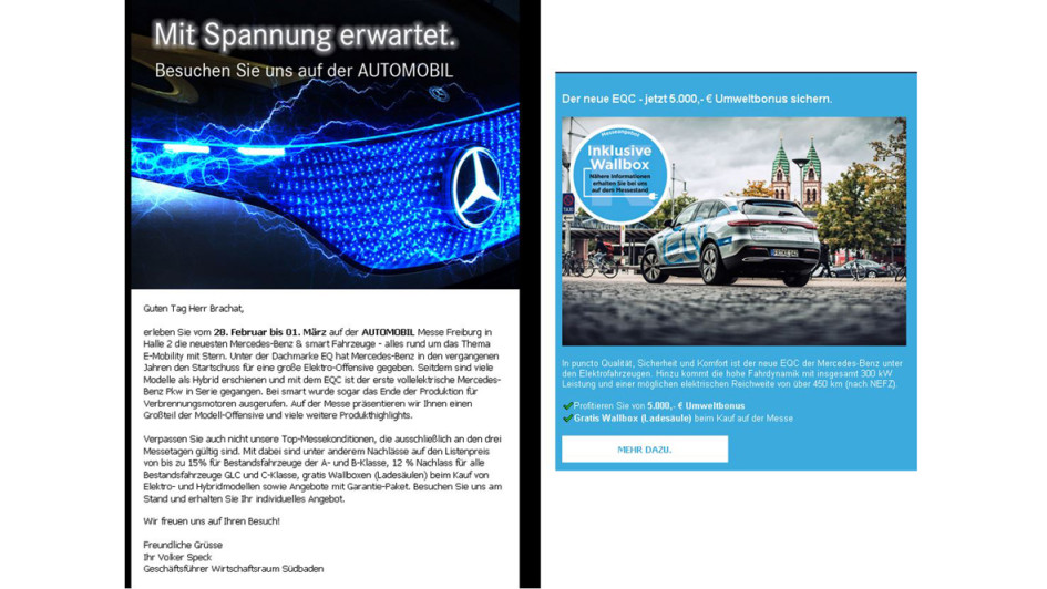 von 28: Die Kestenholzklasse artikulierte sich auch im Vorfeld der Messe. Die persönliche E-Mail-Einladung! "Mit Spannung erwartet", so lautete der Messeaufruf. Mit persönlicher Anrede. Geschäftsführer Volker Speck offeriert im persönlichen Anschreiben die besonderen Offerten und erläutert u.a. den Umweltbonus.