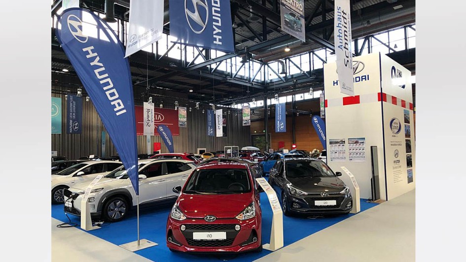 von 28: Das Autohaus Schmid, Freiburg präsentierte die komplette Hyundai-Offerte, vom kleinen Stadtflitzer bis zum großen SUV. Die neue Generation des i10 stand im Vordergrund. Man beachte den kompakten City-SUV Kona Hybrid.