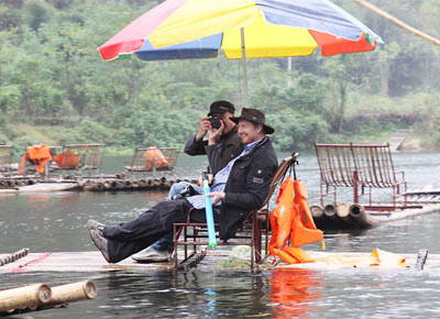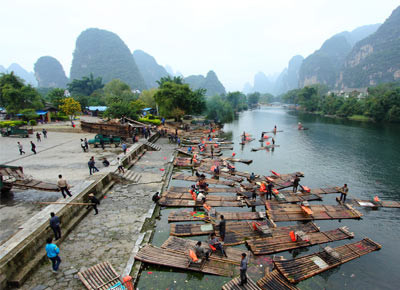 von 12: … sondern auch auf dem Wasser. Am letzten Tag der Tour stand eine Floßfahrt durch die wirklich einzigartige Gebirgslandschaft um Yanghsuo auf dem Yulong River an. Leider war es ein ganz klein wenig regnerisch, was aber unerheblich war … (Fotos im Folgenden: Eva Stadler/AUTOHAUS)