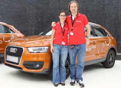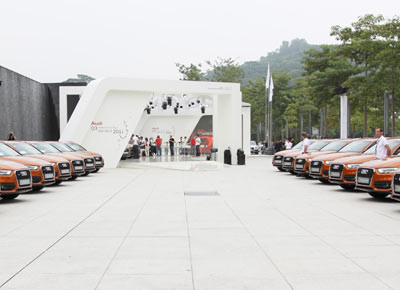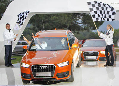 von 12: … das weiße Start-Ziel-Tor aufgebaut, vor dem die Journalisten-Q3 warteten. Los ging‘s auf die Straße. Die Q3 (Farbe übrigens: Samoa Orange) wirkten oft …