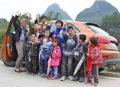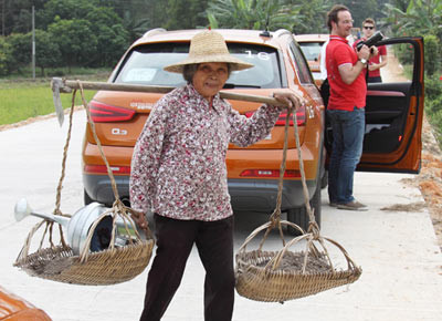 von 12: … war unsere Etappe der Audi Q3 Trans China Tour auch schon zu Ende: Die AUTOHAUS-Redakteurin fährt mit Audi-Ingenieur Alex Riedel durch das Zieltor in Guilin. Mehr Bilder von der Reise gibt es …