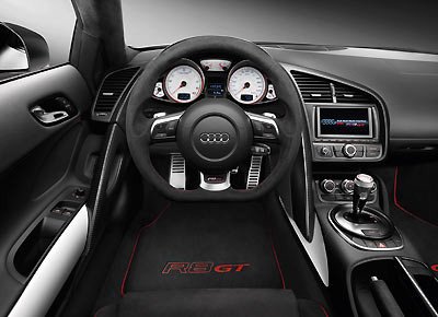 von 11: Wer den R8 GT insbesondere auf der Rennstrecke ausführen möchte, kann mit einem Race-Paket nochmals effektvoll nachschärfen. So gibt es unter anderem Überrollbügel, Vierpunkt-Gurte, Feuerlöscher und Notausschalter für die Batterie.