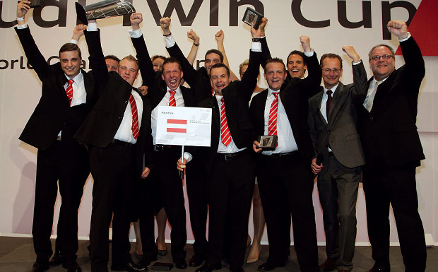 von 5: Am überzeugendsten arbeitete das Team aus Österreich (Porsche Inter Auto/Wien). Den Siegerpokal überreichten Bernd Hoffmann (2. v. r.), Leiter Vertrieb Kundendienst und Original Teile sowie Joachim Bähr (r.), Leiter Service Strategie und Entwicklung.
