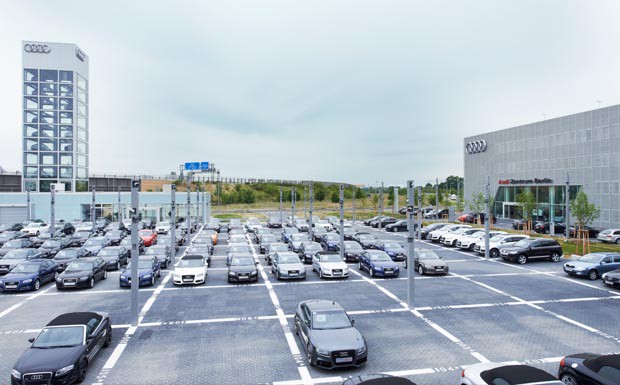 von 22: 20 Fahrzeuge fasst der 31 Meter hohe "Adler-Tower", in dem die aufbereiteten Fahrzeug auf die Kunden im Übergabe-Zentrum zu seinen Füßen warten.