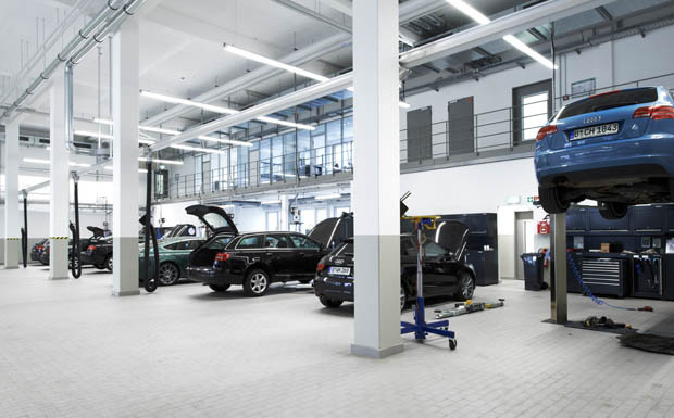 von 22: Die untere der beiden übereinanderliegenden Werkstatt-Etagen: Deutlich sichtbar die riesigen Hebebühnen-Kassetten an der Decke.