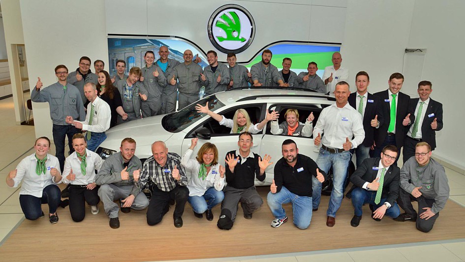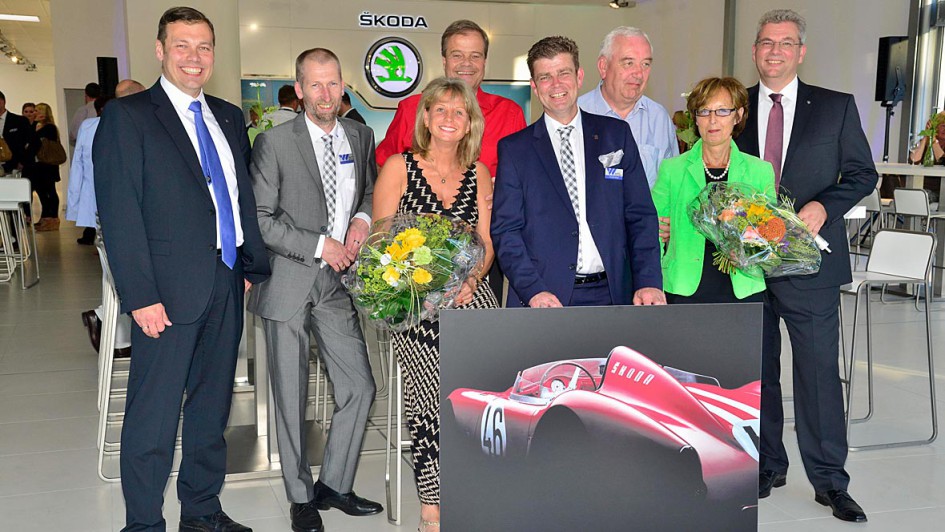 von 3: Bernhard Krebs (Skoda), Kai Katzmann (Auto Wichert), Bernd Glathe mit Frau Anja, André Teloy, (Auto Wichert), Bernd Kußmaul mit Frau Rita sowie Michael Lerch (Skoda)