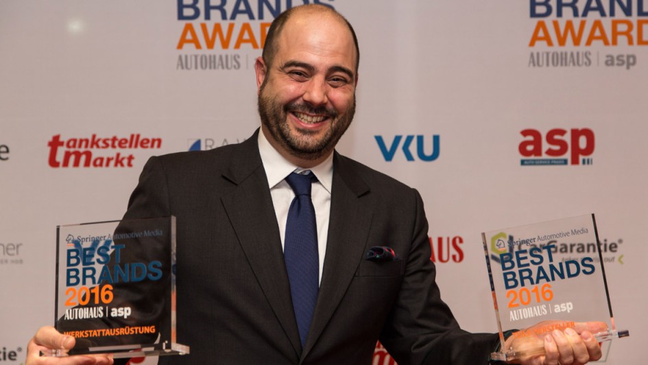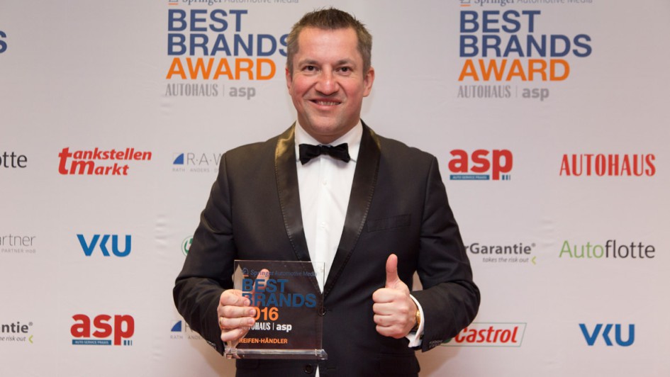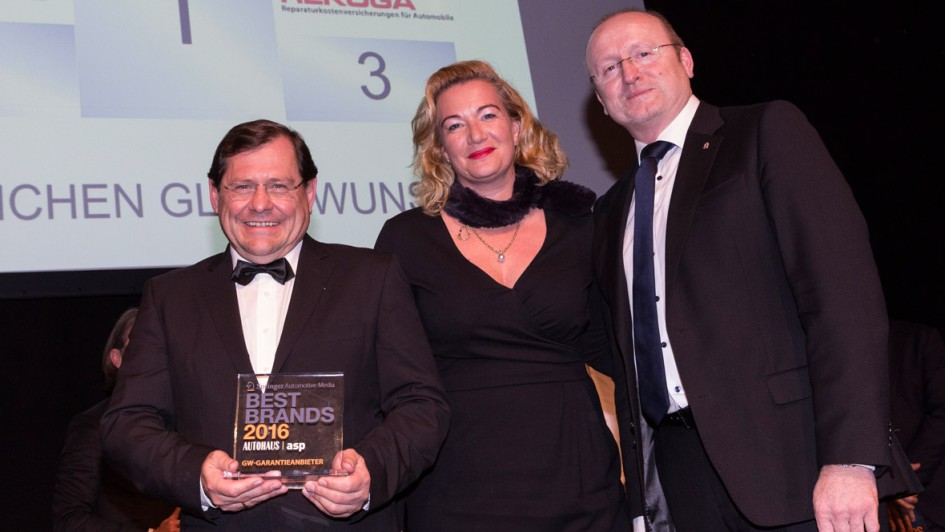 von 18: Die Trophäe für die stärkeste Marke bei den GW-Garantieanbietern holten sich Axel und Ina Berger sowie Dirk Heinemann von der CarGarantie.
