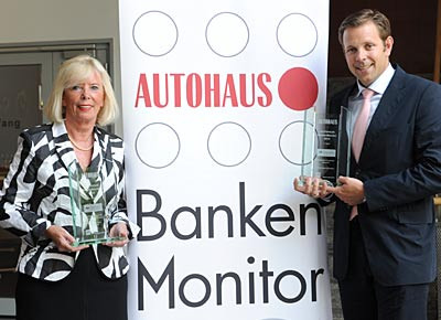 von 11: Gleich zwei Preise in den Kategorien "Unabhängige Autobanken" und "Marken ohne eigene Herstellerbank" (für Kia) gewannen Generalbevollmächtigte Marion Johl und Vertriebsdirektor Jörn Everhard von der Santander Consumer Bank.