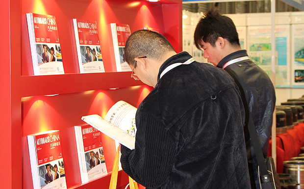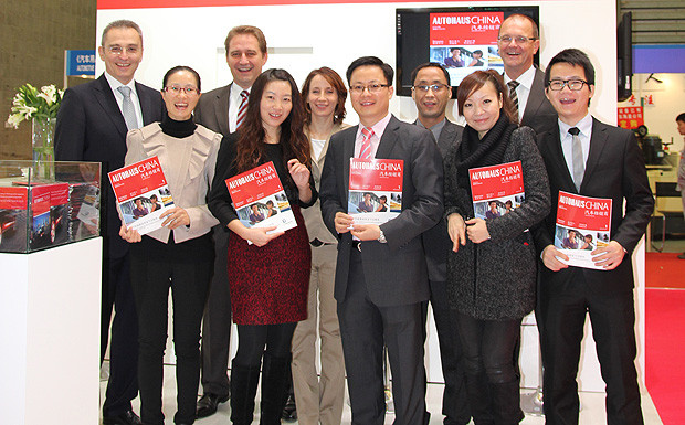 von 14: Freuten sich zusammen mit dem deutsch-chinesischen Team über den gelungenen Start des Magazins: Joachim Krieger, Geschäftsführer Springer Fachmedien München (l.), Jor Zhou, Head of Corporate Development der Messe Frankfurt Asia Holding Ltd. (6.v.l.), und Ralph M. Meunzel, Verlagsleiter Springer Automotive Media.